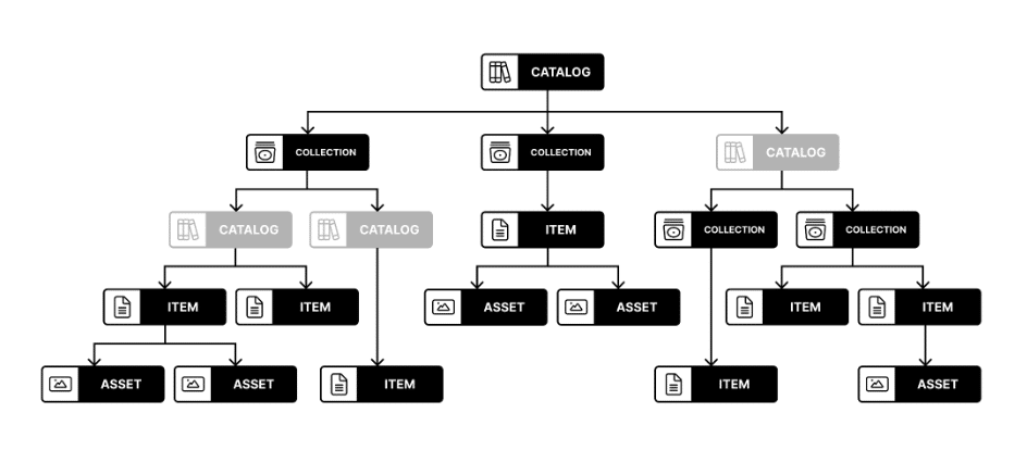 file contains links to some combination of other STAC Catalogs, Collections, and/or Items. We can think of it like a directory on a computer although it doesn’t necessarily need to mirror the local directory tree.